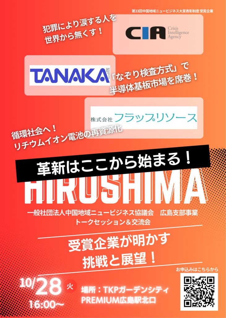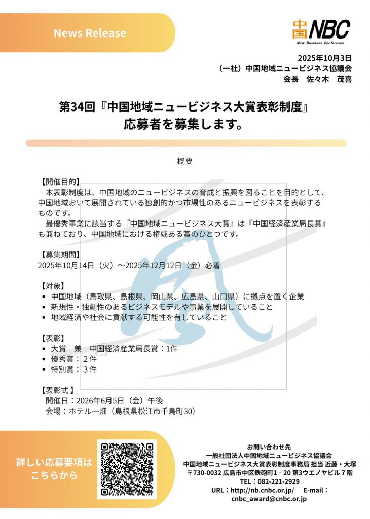 NEW!中国地域のニュービジネスの育成と振興を図ることを目的として、中国地域において独創的かつ市場性のあるニュービジネスを展開している企業(LLP、NPO等の団体・個人事業を含む、以降同様)を表彰する。