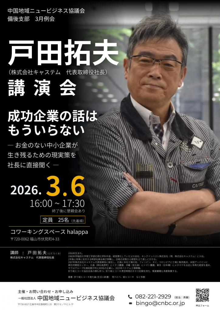 【3月6日開催】《備後支部》3月例会 株式会社キャステム 戸田拓夫氏 講演会