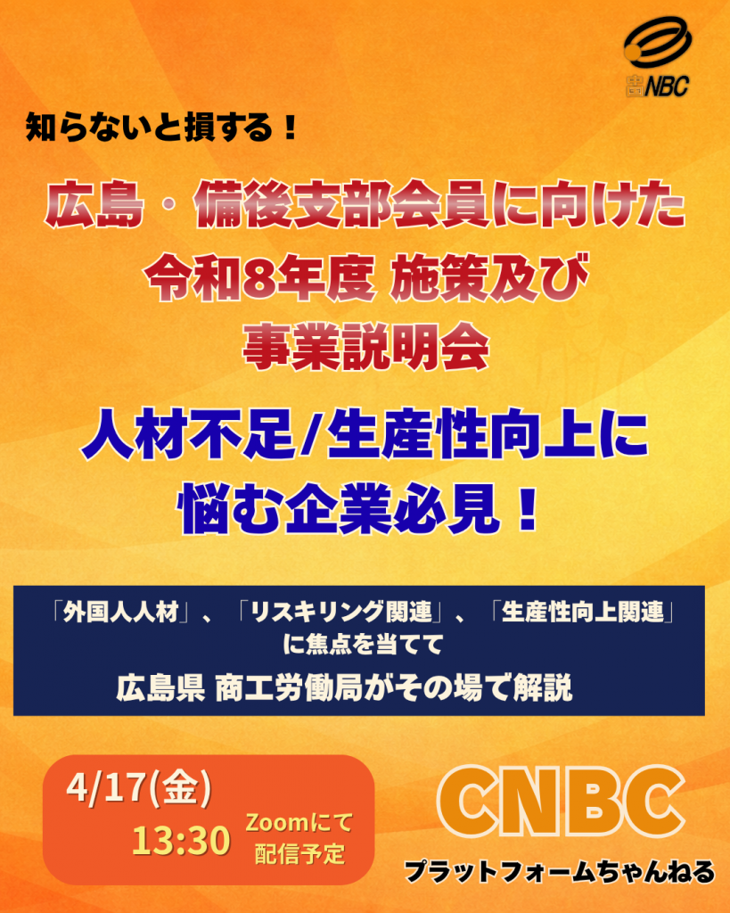 CNBCプラットフォームちゃんねる|第4回(特別編)Zoom配信のご案内 ※ 本配信は、中国NBC 広島支部・備後支部会会員限定となります。